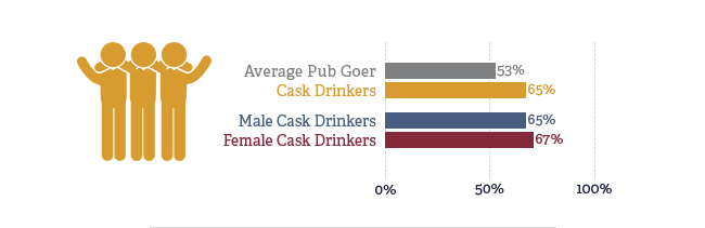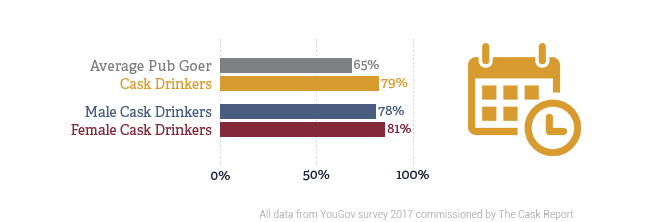 When it comes to spontaneously going out for a drink, 65% of cask drinkers are likely to head to the pub compared with 53% of average pub-goers, while when going out for a planned meal or drink more than three-quarters (79%) of cask ale drinkers are likely to head to their local compared with 65% of average pub-goers.
