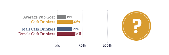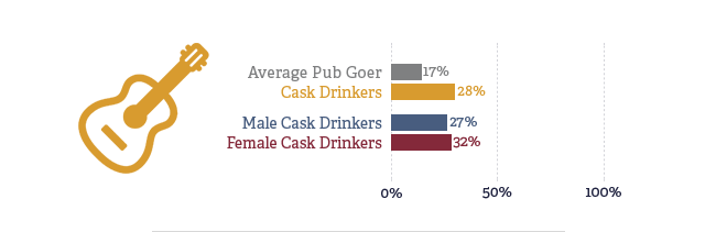 Almost one-quarter (23%) of cask ale drinkers are more likely to attend the pub to watch sport compared with 13% of average pub-goers. Meanwhile, almost one-third (30%) of cask ale drinkers are more likely to go to the pub to take part in a pub quiz compared with 19% of average pub-goers, while more than one-quarter (28%) of cask ale drinkers will head to their local to watch live music compared with 17% of average pub-goers.